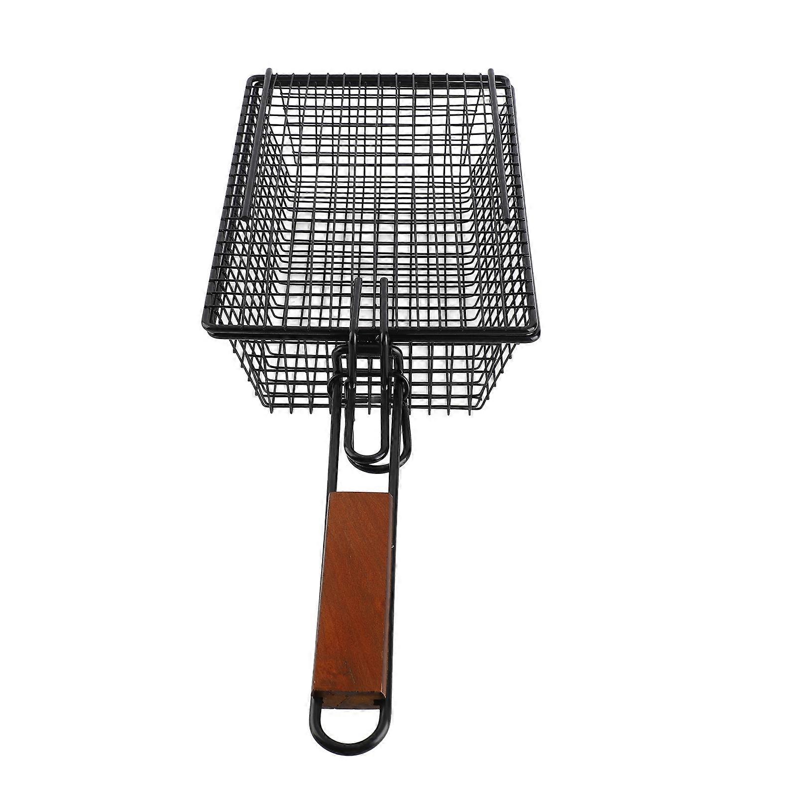 Nonstick Grill Basket with Lid and Foldable Removable Wooden Handle, Metal Barbecue Tool for Fish Vegetable Steak Meat Shrimp BBQ