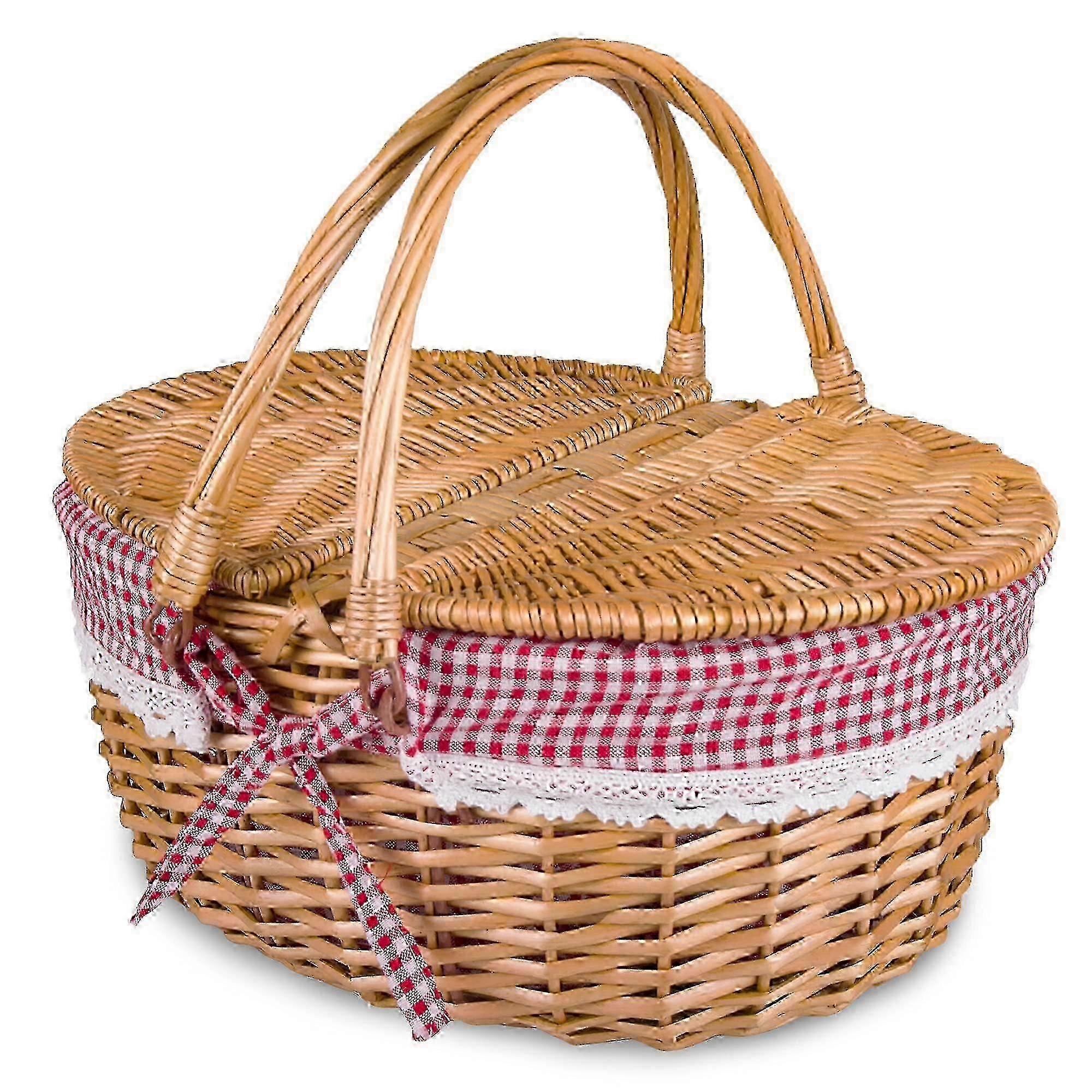 Wicker picnic basket with lid and handle washable checkered lining robust woven body, red