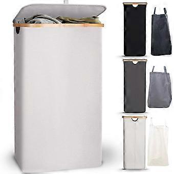 Essential Organizer: Store dirty clothes, blankets, shoes and more with this laundry hamper. With its lid design, you can place it in your bedroom, bathroom, laundry room and college dorm. Ideal for home storage use, its neutral style matches any decor.Removable Inner Bag: Secured on all sides by 4 olive buckles, this dirty clothes hamper has a removable inner bag for easy carry and separation from the inner basket. The clothes baskets cover design prevents the spread of odors and provides you with a tidy environment.Large Capacity: Measuring 16.9 x 12.6 29.5 (43 x 32 x 75 cm) and with a capacity of 100L, this large laundry basket can hold 2-3 loads of clothes with ease. The sturdy and freestanding structure can bear up to 26.5lbs/12kg of load without collapsing.Easy to Install & Fold: Our clothes hamper with lid is designed with easy assembly in mind. Just insert 4 included support rods into the corners and the basket will stand upright. Likewise, remove the poles when not in use and fold for easy storage.Easy to Carry: Made of high quality polyester fabric and bamboo, this laundry bin is light and easy to carry. Two bamboo handles provide firm and steady grip when moving from a room to another.