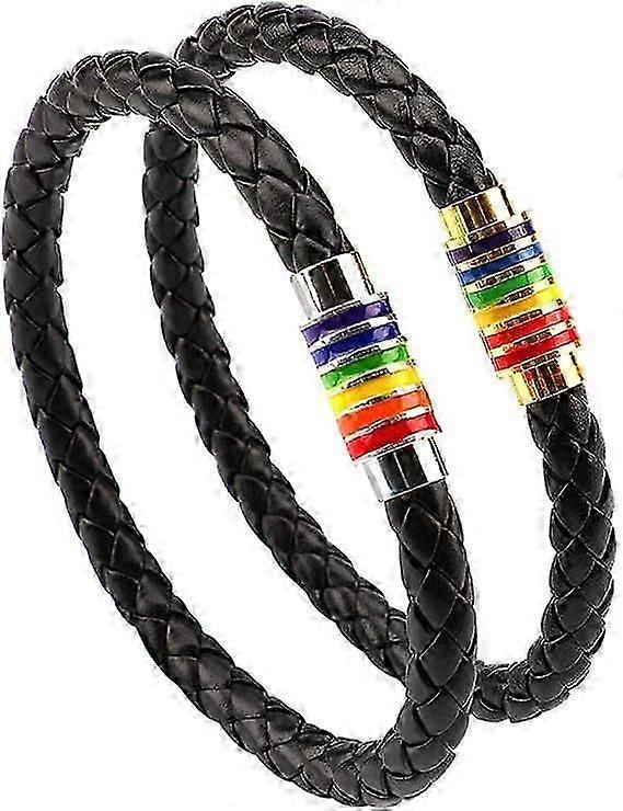 Gay Pride Bracelet Rainbow Bracelet (2 Packs),Couple Black Leather Bracelet Mens Womens Bangle with Rainbow Striped Magnetic Clasp 22cm
