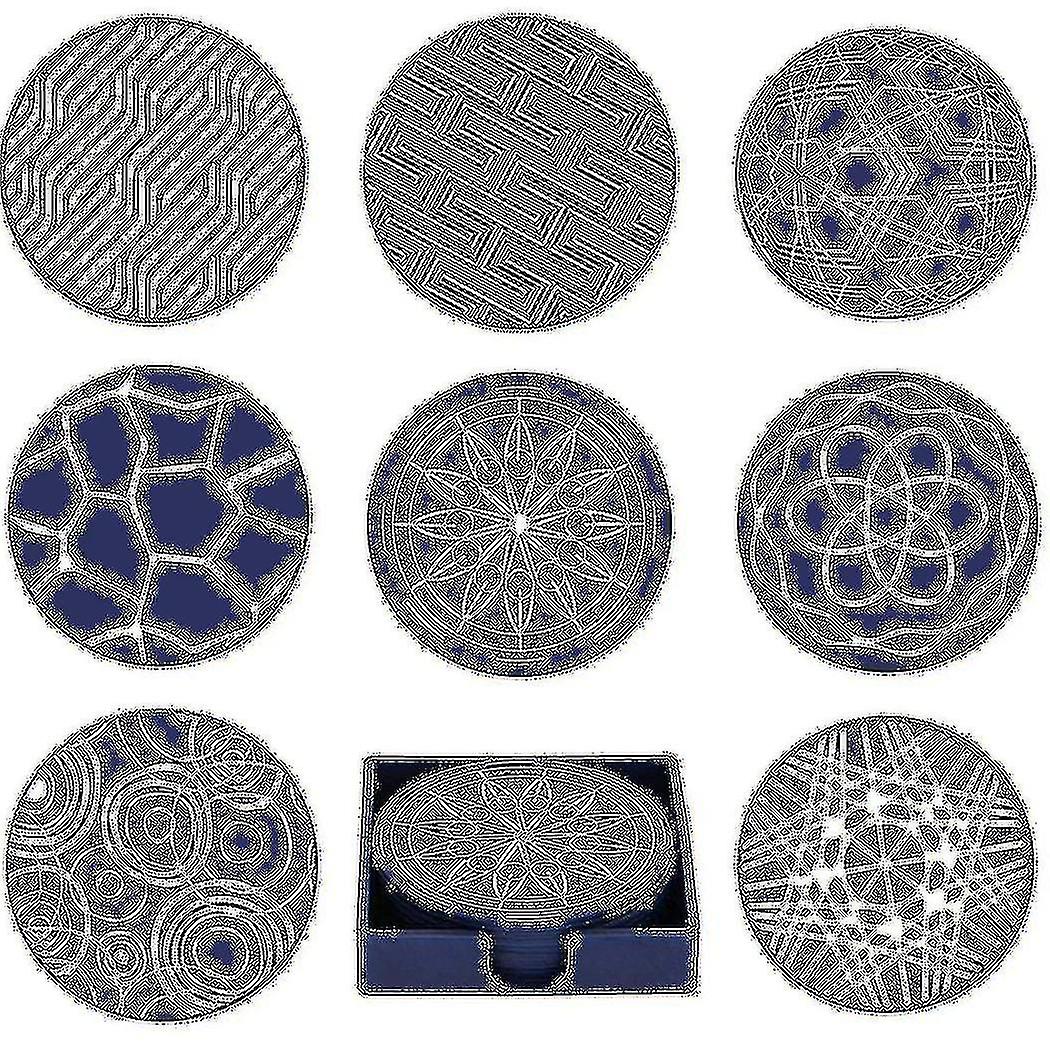 Silicone Coaster Holder: Silicone coasters set include 8 different patterns of round silicone coasters and a silicone coaster holder. Silicone holder can provide good decoration and the messy state. Pursue being close to nature to enjoy a green and healthy life.Non Slip: Using the silicone coasters can make your glass stay on the table stably. Silicone coaster is designed with a special high non-slip surface treatment to ensure excellent desktop grip.perfect Size: 3.86 inches(9.8cm)size suits a variety of cups and mugs so coasters with holder can protect furniture or tabletops from being scratched and worn.Durable and High Quality: Coasters for coffee table are made of high-quality silicone so you can fold them at will. You can also wash them by hand or put them into the dishwasher if it 's dirty. Besides, silicone coasters for drinks won 't sticky front to the table or glass when wet.Great Gift Choice: Coasters set for drinks with a bamboo coasters holder can be a perfect gift choice for Birthdays, Christmas, Valentine's Day, Housewarming, Bar, Office, Kitchen decorations for family, friends.Material: Siliconecolor: BlueSize: 9.8cmSimple design, can be used as desktop decorationEasy to clean, can be washed in water or dishwasherKeep your drink cup from breaking due to slidingSilicone holder provide good storageThe bottom of the coaster is made of silicone non-slip designSuitable for daily using, home decoration, Birthday, Christmas, Halloween, Thanksgiving Day and other memorable days.Care Instruction: Hand wash or dishwasherPackage Contents:8 x coasters1 x storage rackOnly the above package content, other products are not included.Note: Light and different displays may cause the color of the item in the picture a little different from the real thing. The measurement allowed error is +/- 1-3cm.
