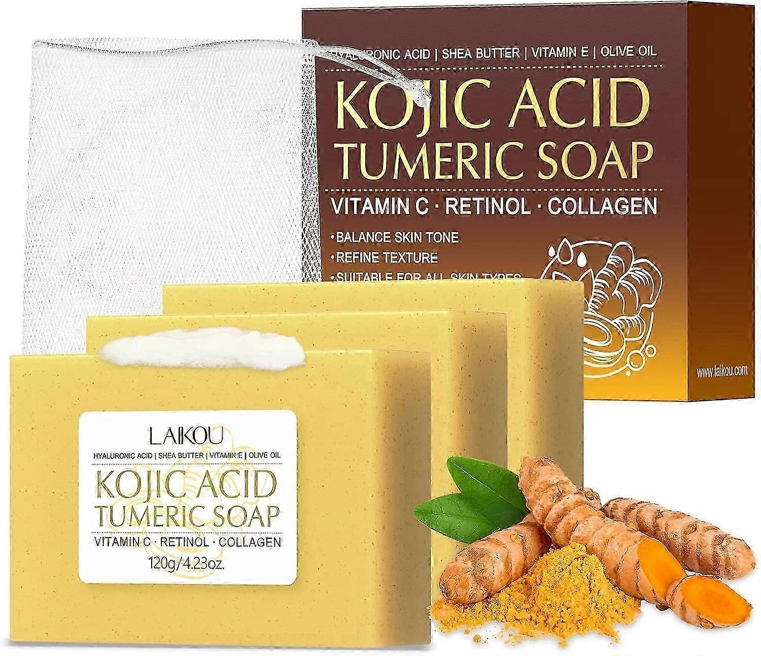 Kojic Acid Turmeric Soap, 3 x 120g Handmade Face & Body Bar for Cleansing & Moisturising, with Vitamin C, Retinol & Collagen, Gentle Soap Bar for Radi