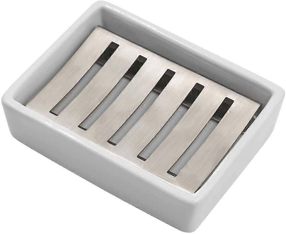 SUS304 Stainless Steel Ceramic Soap Dish for Bathroom, Double Layer, Self-Draining Soap Dish, Say No to Fluffy Soap, Easy Cleaning (White)