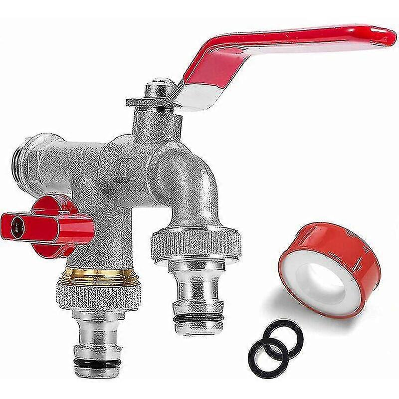 Double Garden Faucet, Faucet With 2 Outlet 3/4 Inlet 1/2, 1 Roll Of Sealing Tape, Double Connection And Hose End For Garden, Rain Barrel, Washing Mach