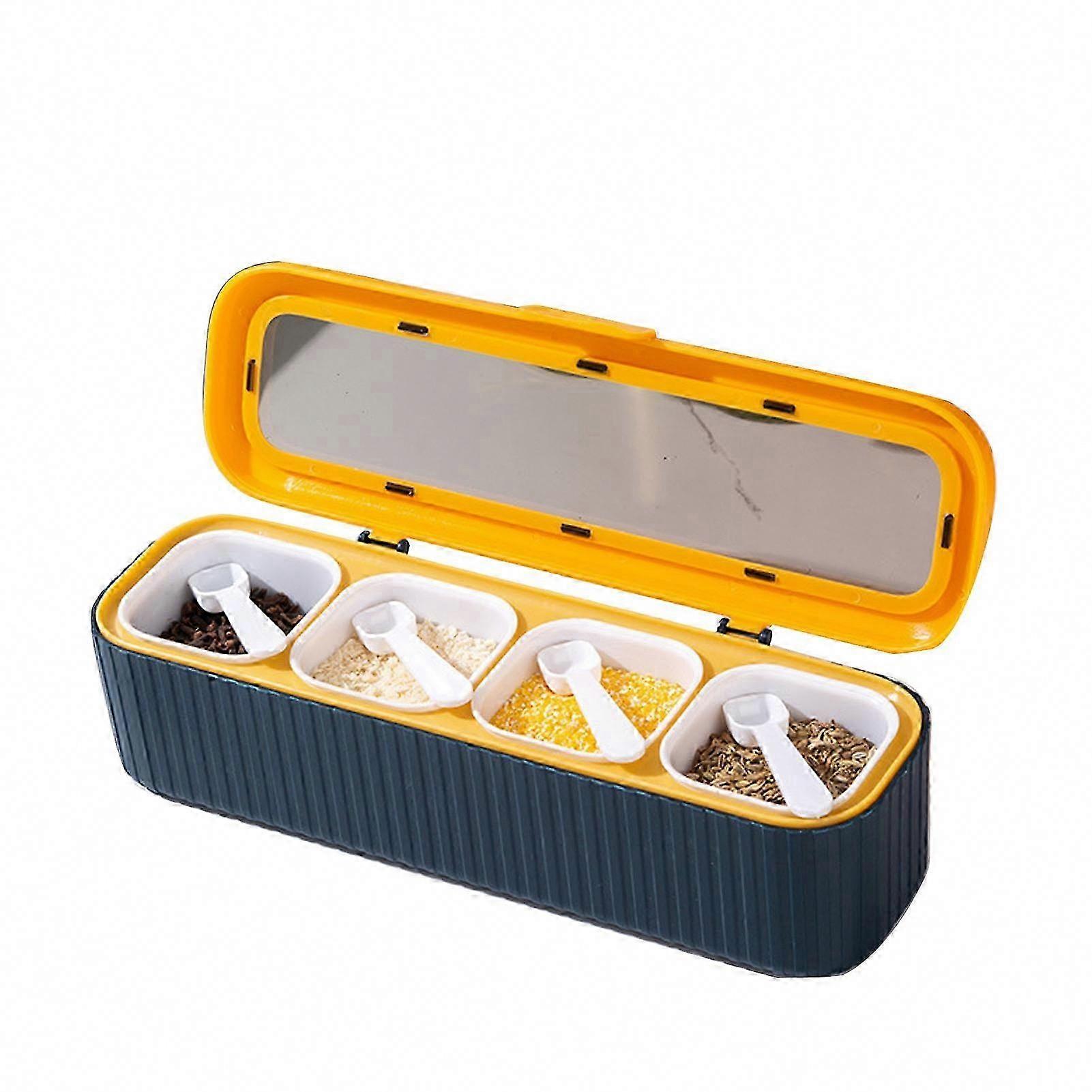Sealed 4-Compartment Spice Storage Box with Spoon - Household Seasoning Container Set in Blue