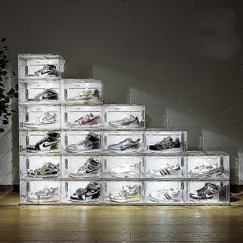Voice-Activated LED Lighted Clear Plastic Magnetic Shoe Box, Three-Speed Adjustment Mode, Stackable and Foldable Shoe Box (Transparent,1 Box)