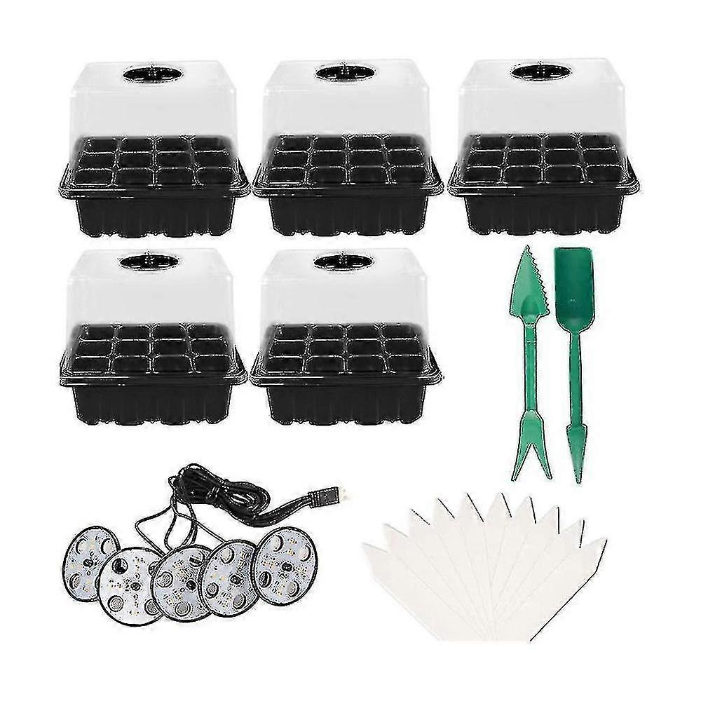 [Value Package]A complete seed kit includes - 5 x Seed Trays (12 Cells per Tray), 5 x Humidity Dome, 5 x Plant Grow Lights(8 per light), 1 x 5 in1 USB connect line, 5 x Watertight Base Tray, 10 x Plastic Plant Labels, 2 x Plant Tools. Perfect for seed starting, seed germination, seedling starting, succulent cuttings or other plant clone propagation.[Easy Control]Seed kit's growing light is upgraded to 8 per light (2 blue + 6 white ), like full-spectrum sunlight that offers the best for seed germination. Each transparent dome has 4 adjustable circular , can adjust the inner humidity and temperature by rotating the regulator, air circulation, help seed growth.[High Humidity Dome]3.2inch Higher transparent lid design provides more space for seed growth, allows you to keep an eye on the growth of seedling or plant at any time. You can start , peppers, cucumbers, eggplants, flowers, etc.[Premium Materia] Seed Trays are made of high-quality plastic, which is reusable and more durable. Seed trays with drain holes at bottom of each cell for proper drainage and to prevent the system from absorbing too much water, which can protect the from rot, the clear plastic makes it easy to observe your plants without messing up their growth, the bottom seedling tray retains overflow water to prevent leaking. Also great for use.[Grow Health and Efficient] Seed kits are the perfect size for the growth of small seeds of plant seedlings. For vegetables, strawberries, flowers, fruits, and other plants. It can artificially control the light quality, intensity, and ; humidity, temperature, keep plants in the best growing environment all the time, effectively shorten the growth time, and improves crop yield and quality. An perfect gift for the den .Colour:BlackMaterial:plasticSize:18.5x14.5x16cmPackage Contents:5 x Seed Trays (12 Cells per Tray)5 x Humidity Dome,5 x Plant Grow Lights(8 per light)1 x 5-in-1 USB connect line5 x Watertight Base Tray10 x Plastic Plant Labels2 x Plant ToolsOnly the above package content, other products are not included.Note: Light reflection and different displays may cause the color of the item in the picture a little different from the real thing. The measurement allowed error is +/- 1-3cm.
