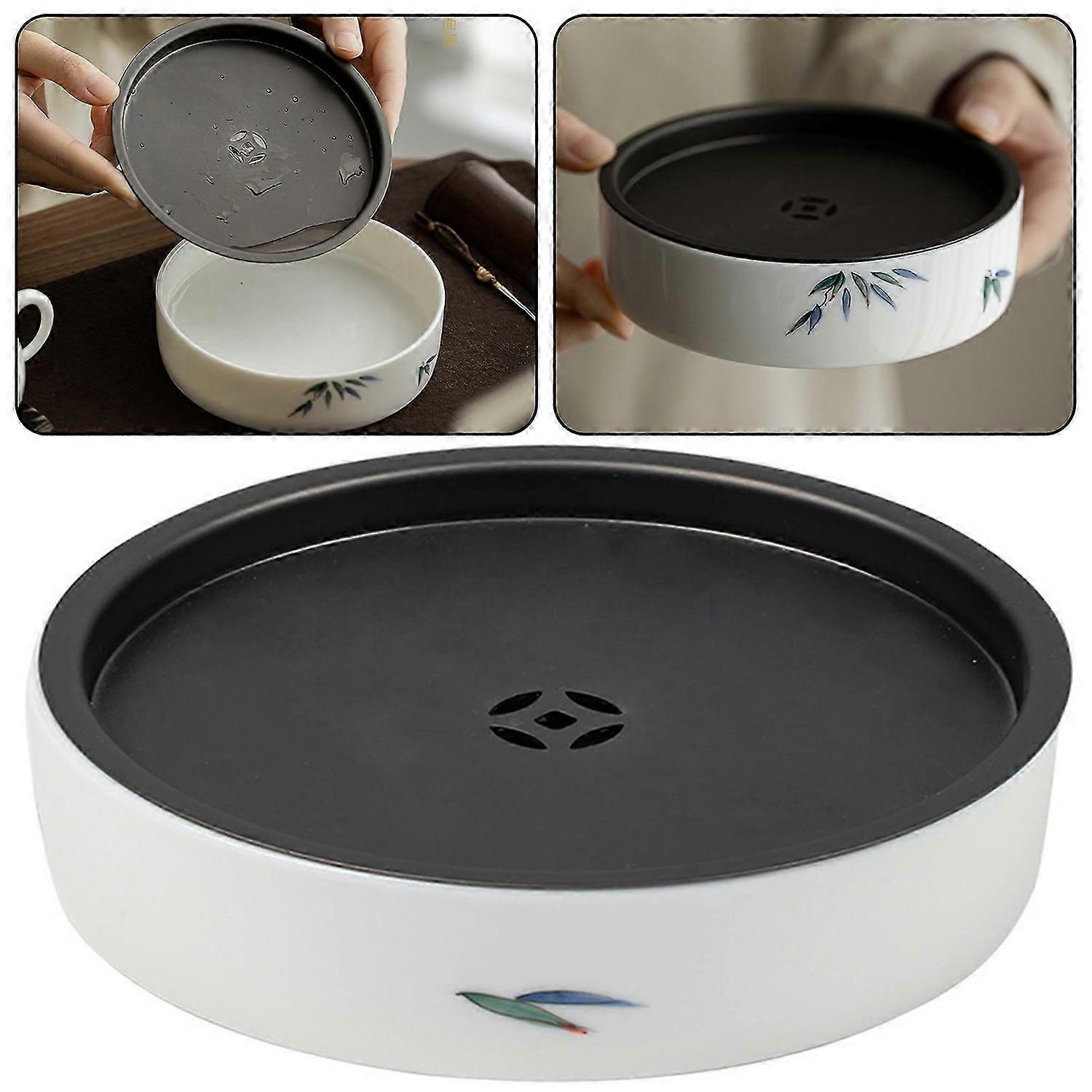 Hand-Painted Bamboo Series Gongfu Tea Tray, Ceramic Water-Catching Base, Dry Brewing Station with Drip Pan