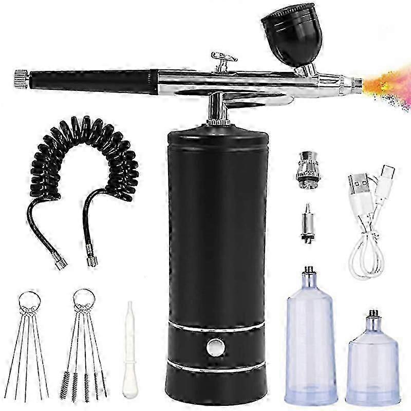 [Superior Airbrush Technology]Elevate your artwork with precision and control using our state-of-the-art airbrush kit with compressor. Its dual-action trigger ensures a and even flow of paint, while adjustable air pressure lets you create intricate details and fine lines. The high-quality materials make this airbrush kit durable and easy to clean, making it perfect for professional artists and beginners alike.[Higher Air Pressure and Larger ]Our airbrush kit features a higher air pressure up to 30PSI than similar products on the market, making it easier to achieve your desired results. The larger allows for more precise and efficient painting, while the 0.3mm nozzle is perfect for watercolor pigments, inks, and dyes. Please note that acrylic paint should be properly diluted with distilled water or commercial thinners specifically made for acrylic .[All-In-One Kit with Compressor] Get everything you need to start airbrushing with our all-in-one kit, which includes high-quality airbrush, cleaning brush, and more. Its compact and portable design makes it easy to take with you wherever you go. Whether you're into cake decorating, makeup application, or automotive painting, our airbrush kit has got you covered.[Versatile and Multiple Uses]Our airbrush kit is perfect for a wide range of applications, including art painting, cake decoration, nail art, handicrafts, model coloring, illustrations, temporary tattoos, hobbies, and more. With its versatile airbrush and adjustable pressure settings, you can achieve a of effects and finishes on any surface.[Convenient and Efficient Charging: Our airbrush comes with a USB charging cable that supports 2A fast charging technology. The upgraded circuit and battery allow for a working time of 1-2 hours after a full charge, compared to others that only last 30-50 minutes. The battery level display and auto-stop feature easy to use, while the included accessories such as the liquid extraction dropper, spray cleaner, wash needles, and capacity cups provide added convenience.note: Some accessories are random from batch to batch, Cannot be chosen the specific accessoriesMaterial: Metalcolour: blackPackage Contents: 1 x Airbrush1 x Air pump2 x cup1 x Dropper1 Set x Brushes1 set x Circular needle1 x USB Cable1 x English InstructionOnly the above package content, other products are not included.Note: Light reflection and different displays may cause the color of the item in the picture a little different from the real thing. The measurement allowed error is 1-3cm.