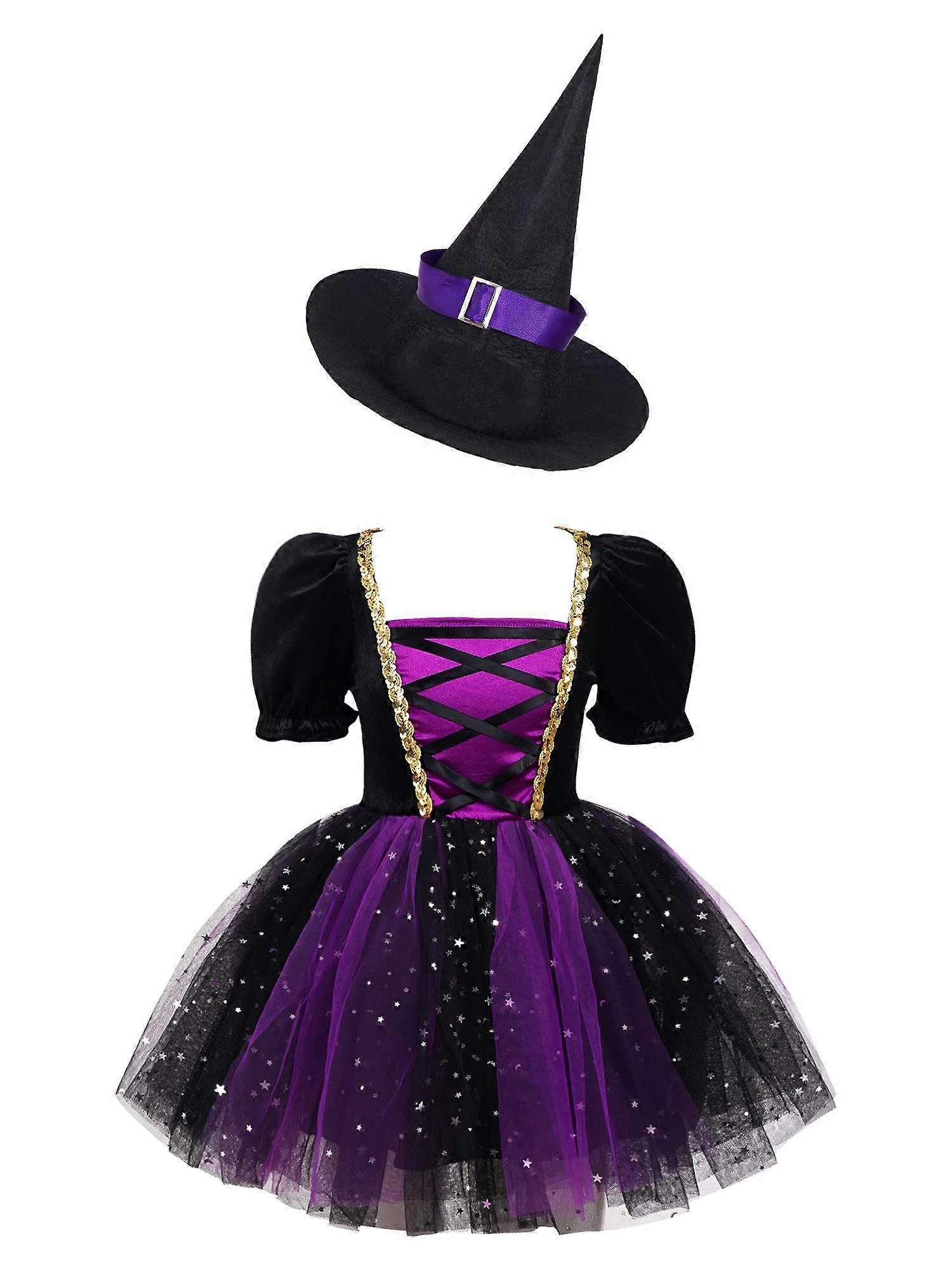 Kid Girls Witch Costume Short Bubble Sleeve Glittery Mesh Tutu Dress with Pointed Hat for Halloween Cosplay Dress Up Performance