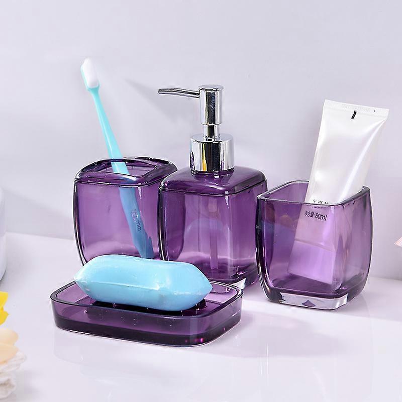Color:Purple ACRYLIC BATHROOM ACCESSORIES SET : Soap dispenser 2.7x2.7x6.1 inches, soap dish 4.9x3.3x0.8 inches,Toothbrush holder 2.7x2.7x3.3 inches, toothbrush cup 2.7x2.7x3.1 inches. HIGH-QUALITY MATERIAL : The purple bathroom accessories uses high-quality acrylic to create a glass effect. Durable, not easy to break and mold; No peculiar smell, high transparency and gloss. FUNCTIONAL: Luxurious sparkle and Modern simplicity design coexist. This purple bathroom accessories set brings luxury, fashion and comfort to your bathroom, and can help you keep your bathroom tidy. PERFECT HOME/BATHROOM DECORATION: The bathroom accessories set will create a luxurious and shiny, stylish and simple bathroom space for you; it is very suitable for the countertop finishing of the bathroom and kitchen, and can be used for bathroom decoration, kitchen decoration, dormitory decoration, hotel decoration, etc. APPLICATION: The purple bathroom set combines luxury and elegance. It can be used in many occasions, such as family bathroom, hotel bathroom, club sink, etc. It can also be used as a housewarming gift to your friends, family, colleagues, neighbors, etc.