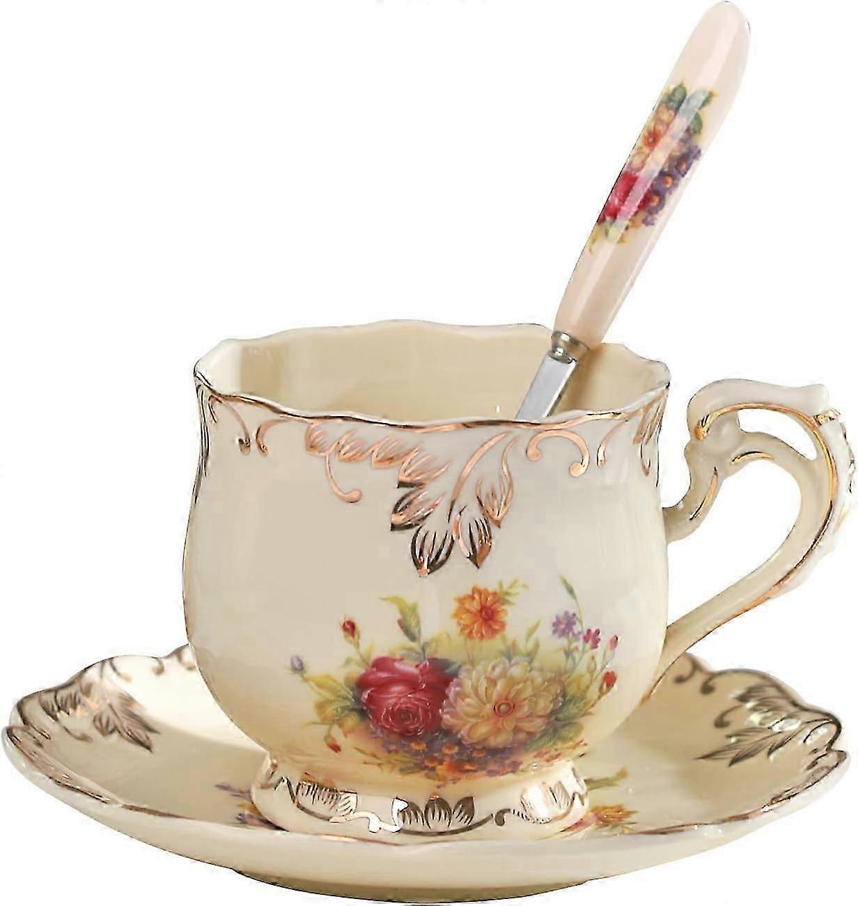 Flowering Shrubs Tea Cup and Saucer Set, 8 oz Vintage Ivory Ceramic Tea Cup Set with Spoon Gifts for Women