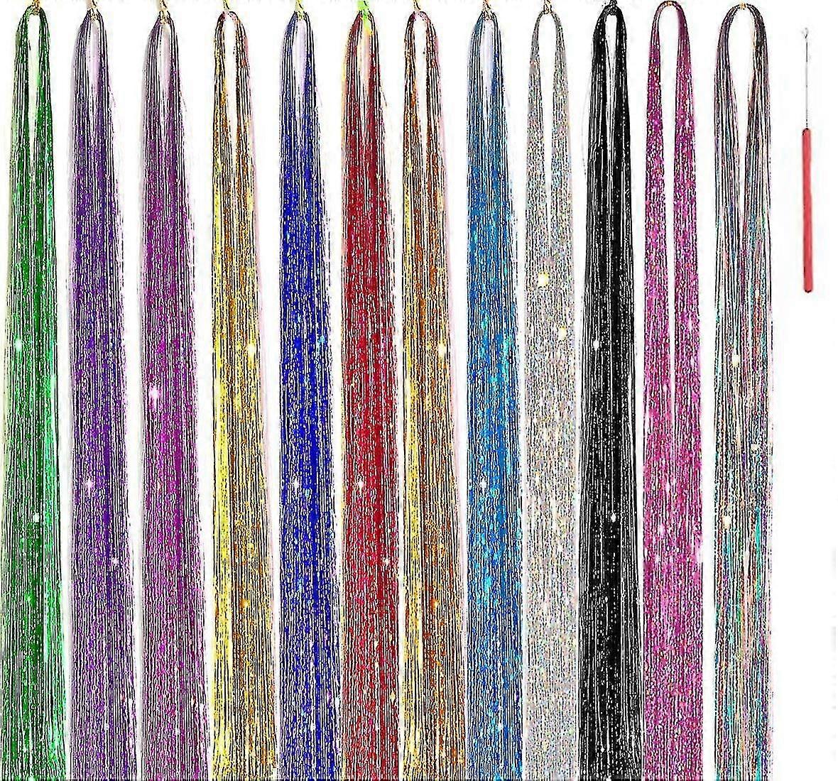 Hair Tinsel Kit, 12 Colors 48 Inch 2600 Strands Hair Tinsel Strands Kit , Heat Resistant & Hair Glitter Tinsel Hair Extensions - Jxlgv