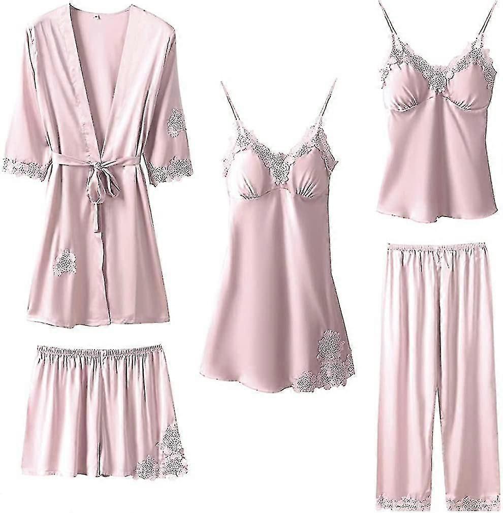 Luxury Women's Silk Satin Pajama Set - 5-Piece Sleepwear with Robe and Shorts for Comfort