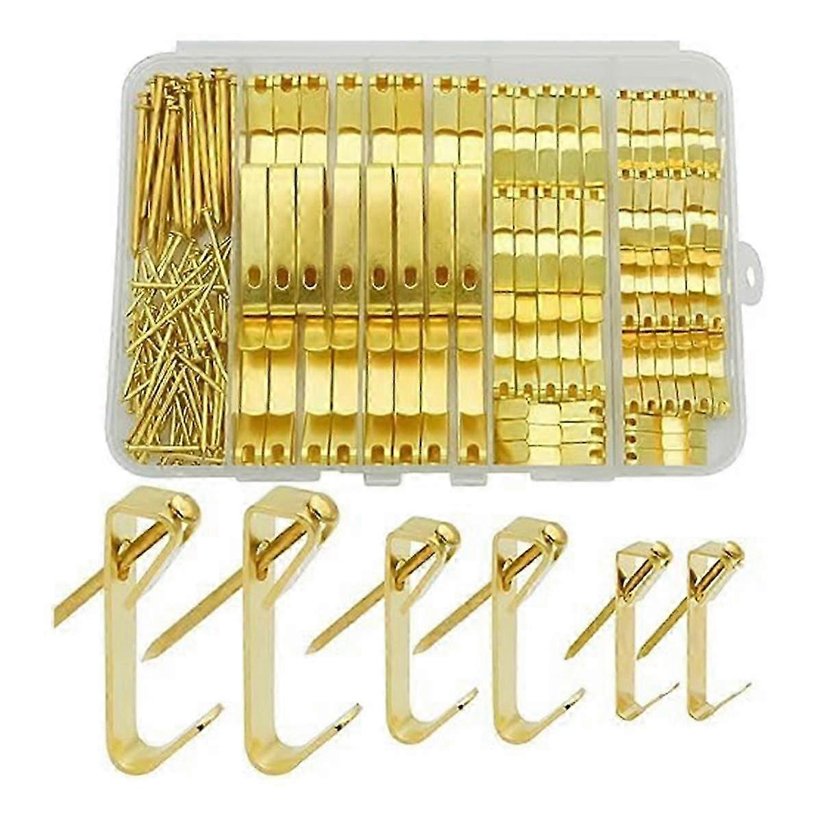 GREAT SET: Set of 100 picture hanging hardware, includes 30 pieces of 50lb, 30lb, 40 pieces of 10lb picture frame hooks and 100 pieces of picture hanging nails to match HIGH QUALITY: Our wall mount is made of high-quality thickened metal, sturdy and . Nails don't bend easily and hooks work perfectly on hard walls QUICK INSTALLATION AND STABLE: The wall mounting kit is practical for hanging photos and artifacts. It is easy to disassemble for recycling, leaving a small hole, which can effectively solve most of life's storage problems Wide application: Our picture frames with nails can be attached to drywall and wood walls for hanging anything you want to display, or hung in your home, office, art or anywhere else you need Special Note: Nails cannot be hammered into concrete or ceramic walls. Due to differences in wall hardness, it is to unload at least half of the hanger's load-bearing capacity Material: Metal colour: Gold Package Contents: 100 x picture hangers with nails Only the above package content, other products are not included. Note: Light reflection and different displays may cause the color of the item in the picture a little different from the real thing. The measurement allowed error is +/- 1-3cm.