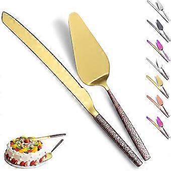 2 Piece Cake Knife Set: 1 Piece Cake Pie Pastry Knife Set, 1 Piece Cake Pie Pastry Server Set. Made of high quality stainless steel, no rust, no corrosion, no bending; standard material is safer in contact with food. Versatile: Perfect for serving cakes, quiches, pizzas, lasagne and tarts. Add more festive atmosphere to your every special day: weddings, birthdays, baby christenings, graduations, Thanksgiving and more. Classic design with polished smooth edges. Mirror finish surface, shiny and glossy. EASY TO CLEAN: Dishwasher safe, but hand washing is recommended to prolong the life of the gold cake cutlery set.