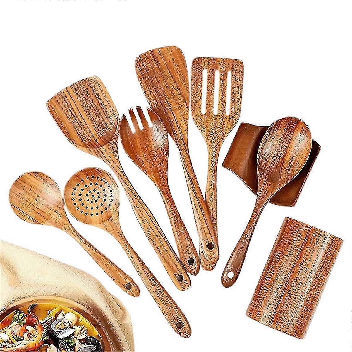 Cooking Set of 9 Natural Teak Wooden Spoons with Holder