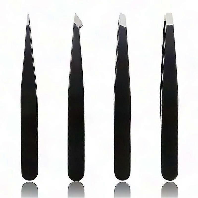 4-Piece Stainless Steel Tweezers Set - Slanted & Pointed Black Tweezers for Precision Grooming