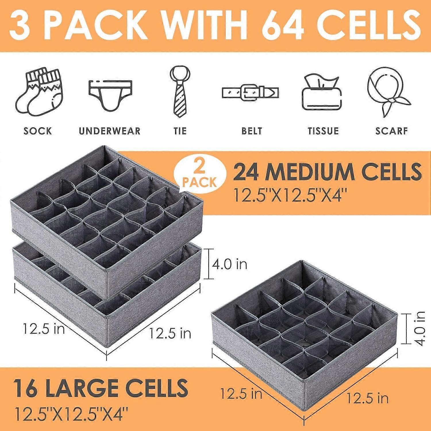 Set of 3 Socks Lingerie Organiser, 64 Compartment Folding Fabric Drawer Organiser Grey