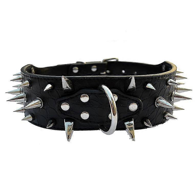 SIZE ATTENTION:width:5cm,length:51cm,suitable neck circumference:37-45cm FASHION SPIKED STUDDED LEATHER DOG COLLAR WITH LEASH: These cool spikes are not overly sharp, so it doesn't hurt your pet's skin and the studs don't pull dogs hair out. After wearing the studded collar, Your animals could not destroy the collar or be bitted around the neck because of the spikes. Gives them added protection during cat/dog war play time DURABLE SOFT PU LEATHER PET COLLARS WITH LEASH: Sturdy dog collars made of soft high-quality microfiber leather and punk spikes; Good sized D-ring which fits perfectly with almost all dog leashes, name tags, and rings. Strong enough to hold cats, small/ medium /large dogs. SURPRISED GIFT: Dogs are one of our best friends and we should give them a proper present on Christmas or birthdays. Dog collars are soft, flexible, and fashionable, spiked studded dog collars can not harm your furbaby's skin. Your pet will love it and this leather dog collar will make your little one look like a gentleman. BEST RIVET PET COLLAR SATISFACTION GUARANTEE: This spiked studded dog collar has been tested by German Shepherds, Mastiffs, Siberian huskies, Labrador, Golden retrievers, and Pitbulls. If there is any quality problem with the spiked dog collar, please contact us