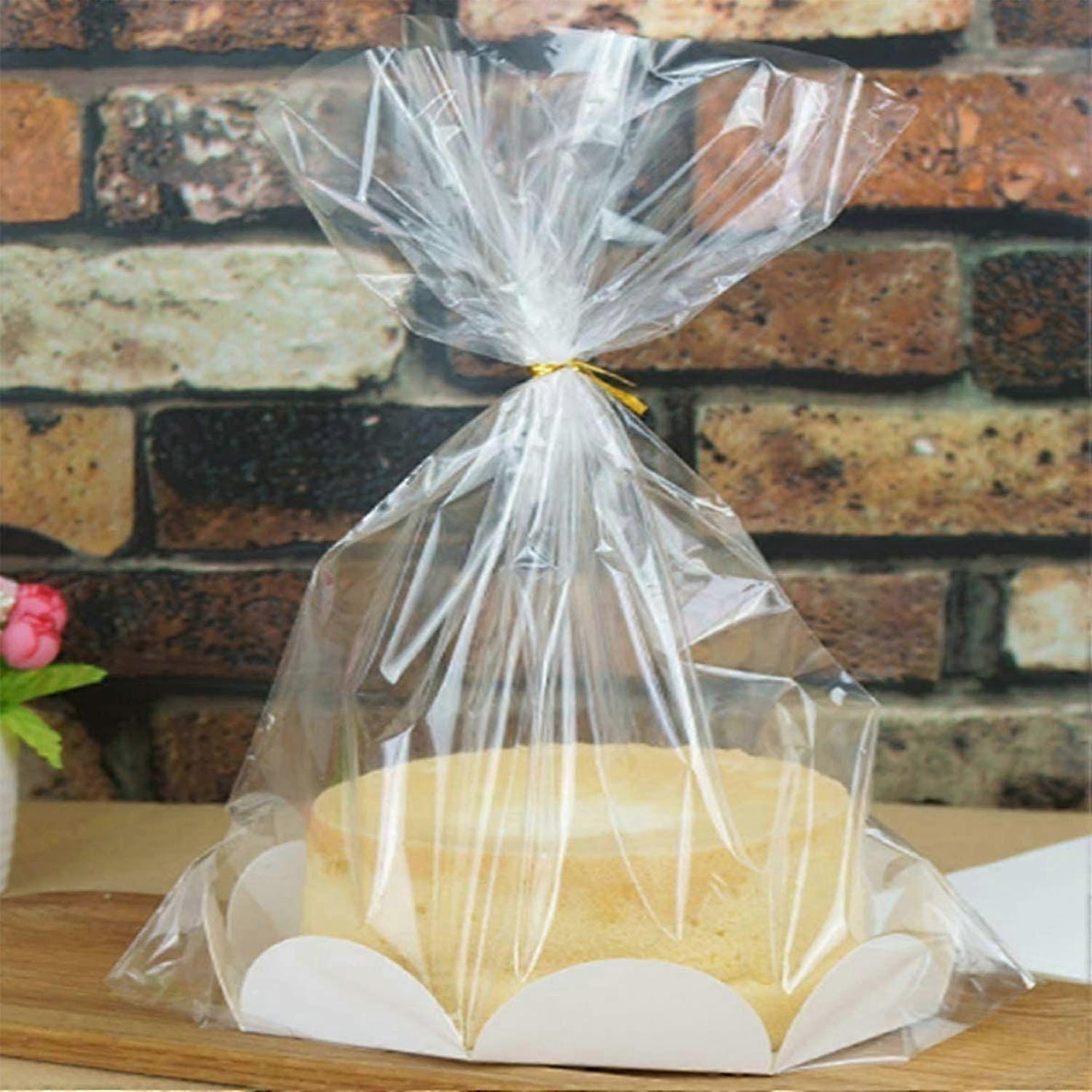 20 Pack Clear Plastic Bake Bags Cellophane Treat Bags, 8in Cake Tray and Gold Ribbon