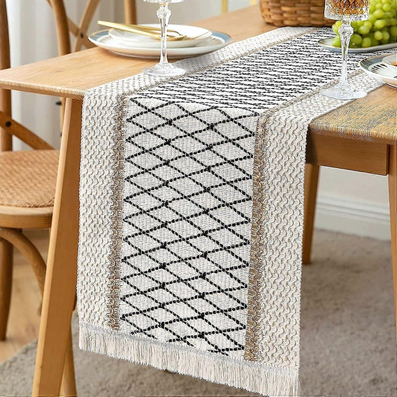 Rustic Macrame Table Runner With Pom Poms, Handwoven, Cotton And Burlap, For Kitchen Table, Dining Room