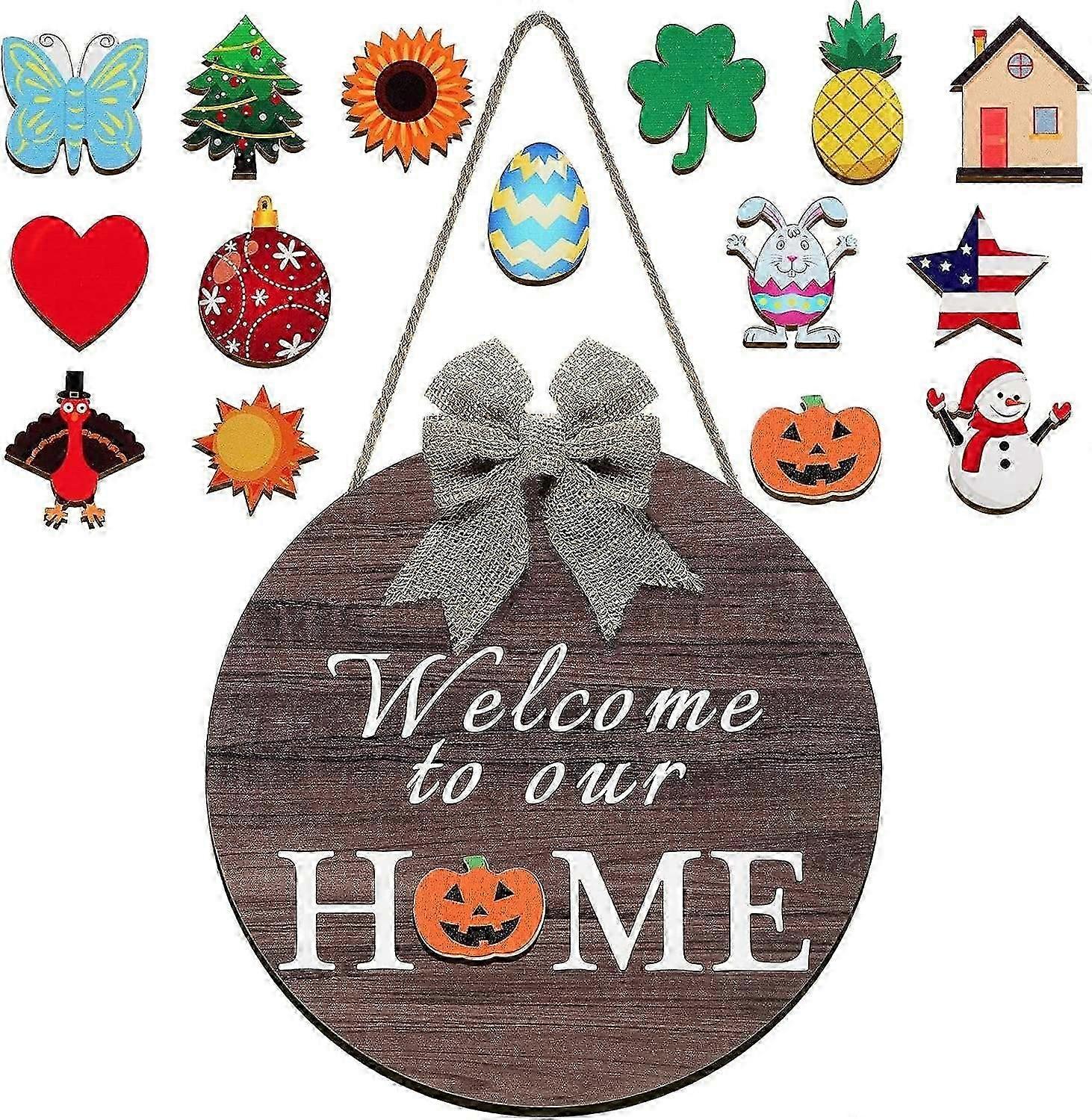 Size and package: you will receive 1 pieces welcome to our home hanging sign which measures approx. 12 x 12 x 0.27 inches/ 30 x 30 x 0.7 cm, large dimension and clear words make visible even from long distance, this package also includes 14 pieces seasonal hanging ornaments for matching with different festivals and replacing by various seasons Assorted patterns: these 14 small hanging ornaments are designed with assorted patterns, such as sun, love, flag, sunflower, heart, butterfly, turkey, pineapple, rabbit, egg, Christmas tree, snowman and more, these diverse ornaments contains velcro design, which makes it easy to attach these ornaments onto the door sign surface, just use them to change and match with corresponding season decorations Reliable and safe: our seasonal welcome door sign and seasonal ornaments are made of wood material, with no odor, safe and durable to use, the smooth surface and classic colors will easily bright up your home decoration Versatile usages: our round wood front door sign with hanging ornament is suitable for any seasons, spring, summer, autumn and winter, it's also applicable for most festivals, such as Christmas, Easter, Halloween, Thanksgiving, Valentine's Day and more Welcome your guests: this interchangeable welcome door sign has designed with burlap bow and printed with some warm words, which could not only welcome your guests and families, giving them a sense of being important, but also can decorate your house, add a happy atmosphere