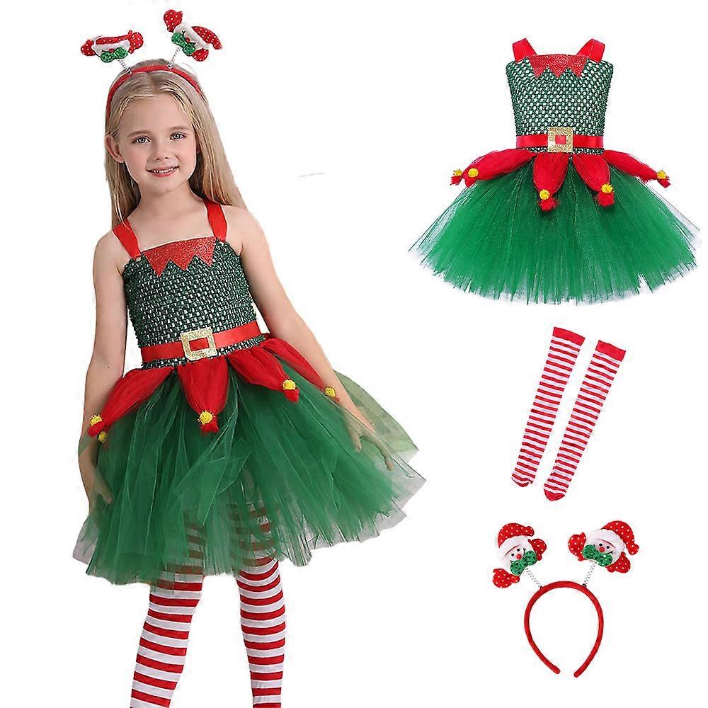 Christmas Kids Girls Sleeveless Tutu Dress with Headwear Socks Set Santa Elf Costume Xmas Costume