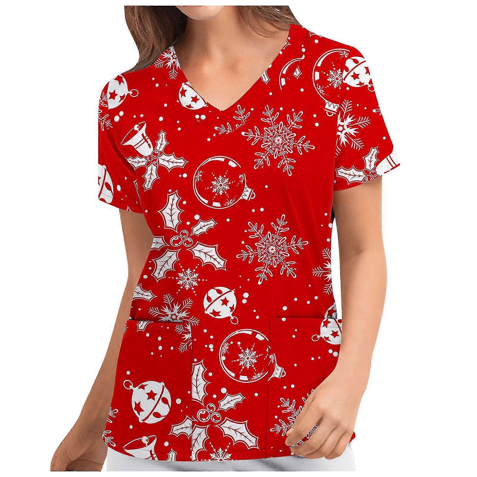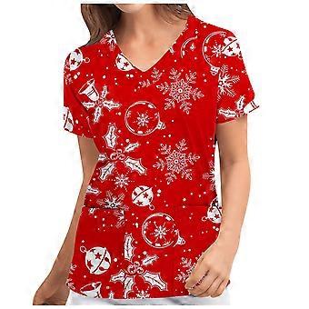 Christmas Women Nursing Uniform Scrub Short Sleeve T-shirt Xmas Blouse Tee Tops V-neck