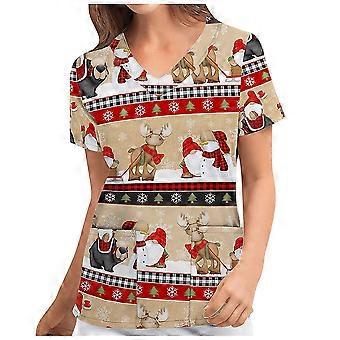 Christmas Women Nursing Uniform Scrub Short Sleeve Tops T-shirt Xmas Work Blouse C