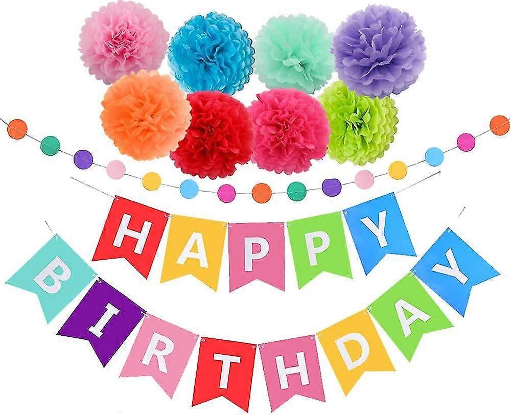 RAINBOW PARTY DECORATIONS: colorful and cheerful birthday banner is an ideal choice for any age birthday party. If you are worrying about how to make a birthday party more attractive, believe me it will become you best choice. Choose it and you will not regret. HAPPY BIRTHDAY BANNER:The banner consist of two parts, the upper one is approx 59 inches long and printed the letters HAPPY in 5 different colors. The lower one is approx 78. 7 inches long and printed the letters BIRTHDAY in 8 different colors. EASY TO DIY: It's so easy to decor. I believe it will become your unforgettable experience. you can hang the banners on the ceiling, mount on the walls and window, or used for table centerpieces to decorate your birthday party. Just enjoy the happy birthday party with your beloved. What You Get: 1). 1*Happy Birthday Banner: the upper one is approx 59 inches with 5 flags; the lower one is approx 78. 7 inches with 8 flags. The flag size: 7. 8inch high, 6. 2inch wide. 6.5ft colorful Paper Garland Circle Dots 2).8*Tissue Pom Poms: diameter is 10 inches for each pom pom; 8 colors(red/rose red/pink/purple/mint green/blue/apple green/orange). Easy to diy: 1).It's so easy to decor. I believe it will become your unforgettable experience. 2).you can hang the banners on the ceiling, mount on the walls and window, or used for table centerpieces to decorate your birthday party.