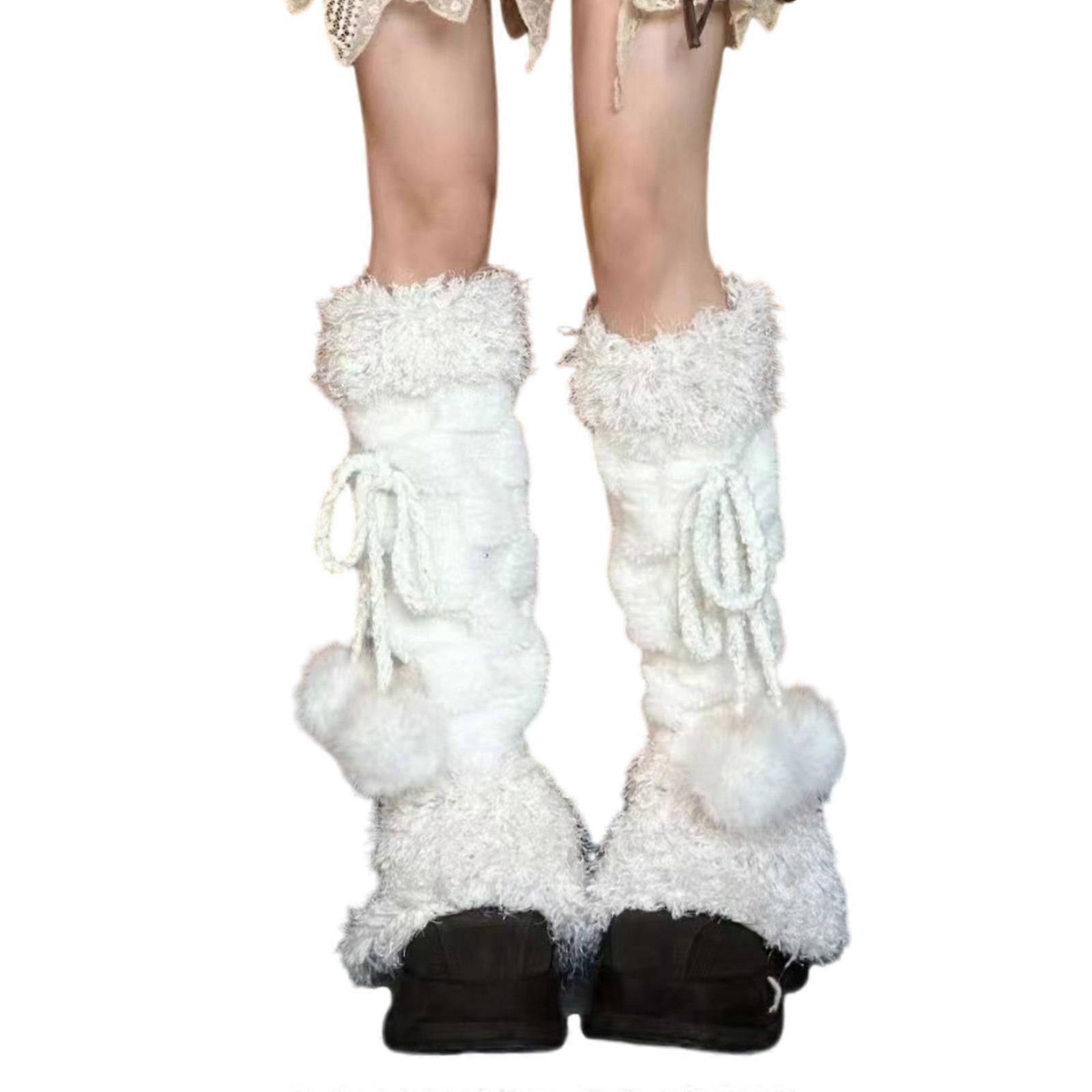 Fuzzy Leg Sleeve Footless Socks with Sweet Plush Balls Bowknot Faux Furs Leg Warmer for Women Winter Boot Toppers Covers