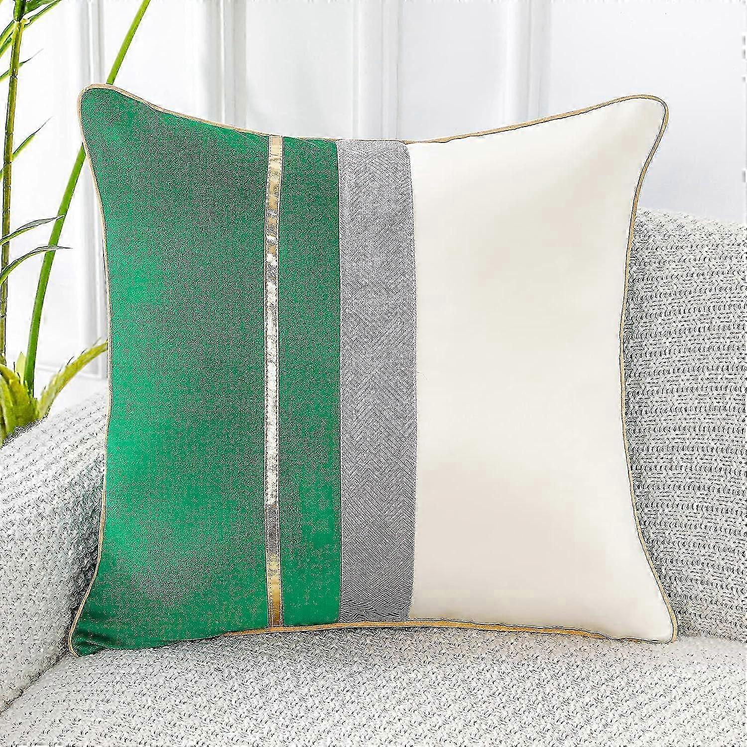 Patchwork Lake Green Silk-Like Velvet Throw Pillow Cover with Gold Striped Leather Cushion Case Modern Luxury Square Pillowcase,16x16 inch