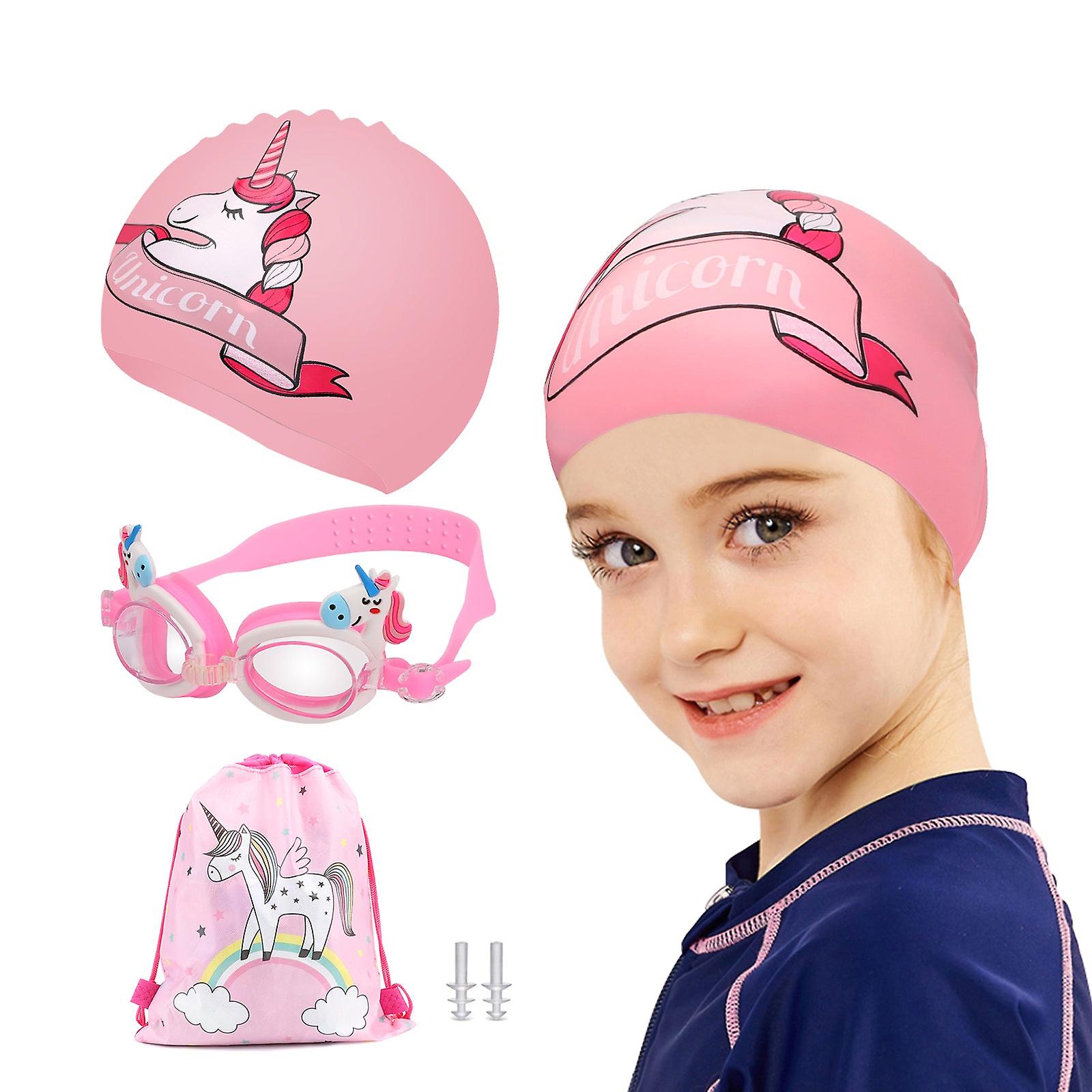 Feature: This set of swimming equipment provides safe and happy swimming experience for your kids. Best Gifts for Kids: Specially designed for children(age 3-12) with short or long hair. Each swim cap comes with a pair of unicorn swim goggles and a unicorn storage bag. Waterproof Protection: 3D ergonomic design can completely cover kid’s ears and hair.Safety & Premium Material: Our swim cap is made of 100% premium silicone material, eco-friendly, non-toxic, tear resistant and durable. The goggles lens is carefully coated with advanced anti-fog coating, which can stops the lens from becoming steamy and offers clear and long distant view. Great Elasticity & Comfortable: The swimming cap features excellent elasticity, can be stretched easily and no deformation. Package includes: 1*swimmimg Goggles 1*swimmimg cap 1*storge bag 2*Earplugs
