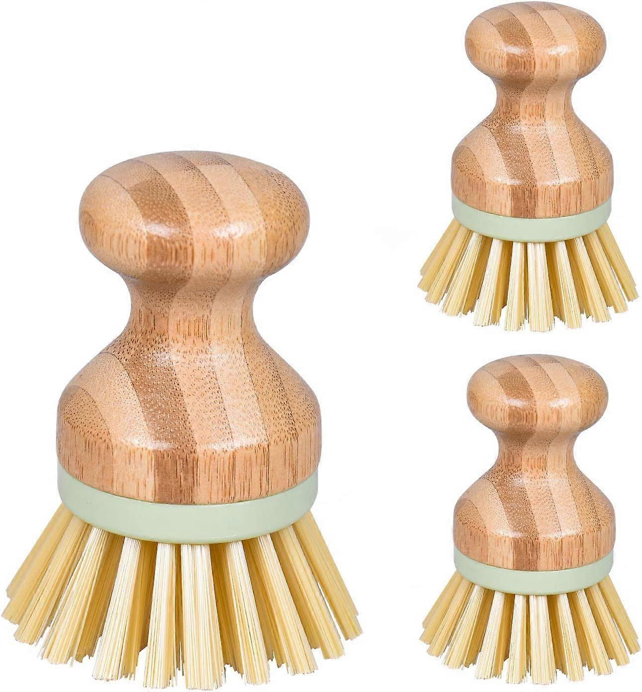 3-Pack Round Bamboo Dish Brush, Mini Kitchen Palm Scrub Brush with Natural Bamboo Handle and Stiff Bristle, Designed for Kitchenware and Household Cle