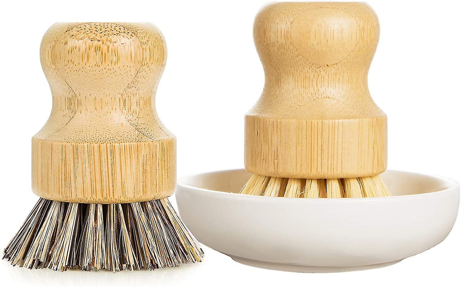 Palm Pot Dish Brush- Eco Friendly Bamboo 2 Packs Mini Durable Scrub For Kitchen Cleaning With Ceramics Holder
