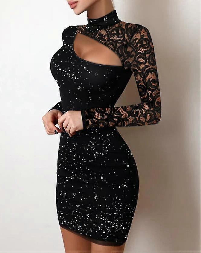 Evening Dresses for Women New Elegant Sexy Party Wedding Guest Glitter Contrast Lace Cutout Long Sleeve Bodycon Mini Dress