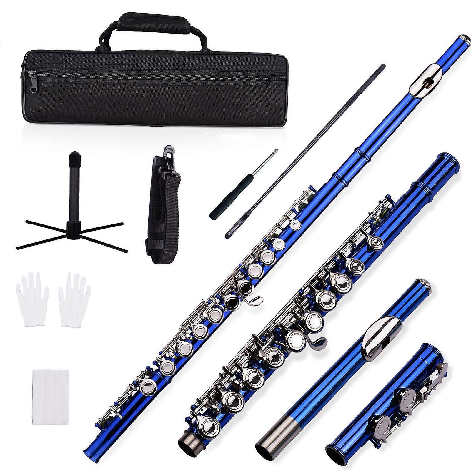 Closed Hole C Flute 16 Keys Cupronickel Nickel-plated Wind Instrument with Carry Case Flute Stand Gloves Cleaning Cloth Mini Screwdriver Cleaning Rod