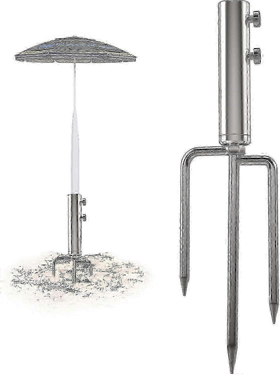 Umbrella Stand Anchor with 3 Spikes, Heavy Duty Metal Parasol Base, Outdoor Umbrella Steel Anchor for Beach Grass SandSturdy and durableThe umbrella stand is equipped with 3 legs, which makes it more stable and stronger than a normal 1/2 leg umbrella stand. The umbrella stand is made from high quality tough and reinforced industrial grade material for long life, it will not be subject to environmental erosion like ordinary plastic umbrella stands. Sturdiness and durability are the biggest advantages. Product SizeThe silver umbrella stand anchor is 36cm long, the ground anchor is 20cm long, the mounting tube is 16cm long and the mounting tube hole is 3cm long. The fastening screw can adjust the size of the diameter. It is removable, the top tube and the bottom ground anchor can be detached for easy storage and portability. MaterialThe umbrella ground anchor is made of heavy duty, high quality metal with a galvanised finish to protect against rust. The threaded adjustment screws are also made of high quality steel, which are not easily damaged and provide good tightness. Less damageCompared to other umbrella stands with their own drill, our parasol base leave fewer marks on the lawn - just a few small, unnoticeable holes and no brown marks on the lawn. This means the umbrella stand holder can stay in one place for a longer period of time without damaging the lawn. Scope of applicationThe parasol stand holder can be used on beaches, lawns and land. It is suitable for umbrella poles with a diameter of less than 3cm. It is suitable for garden umbrellas, swinging drying poles, bird feeding poles, flag poles, string light poles, ball poles, outdoor Christmas trees etc.