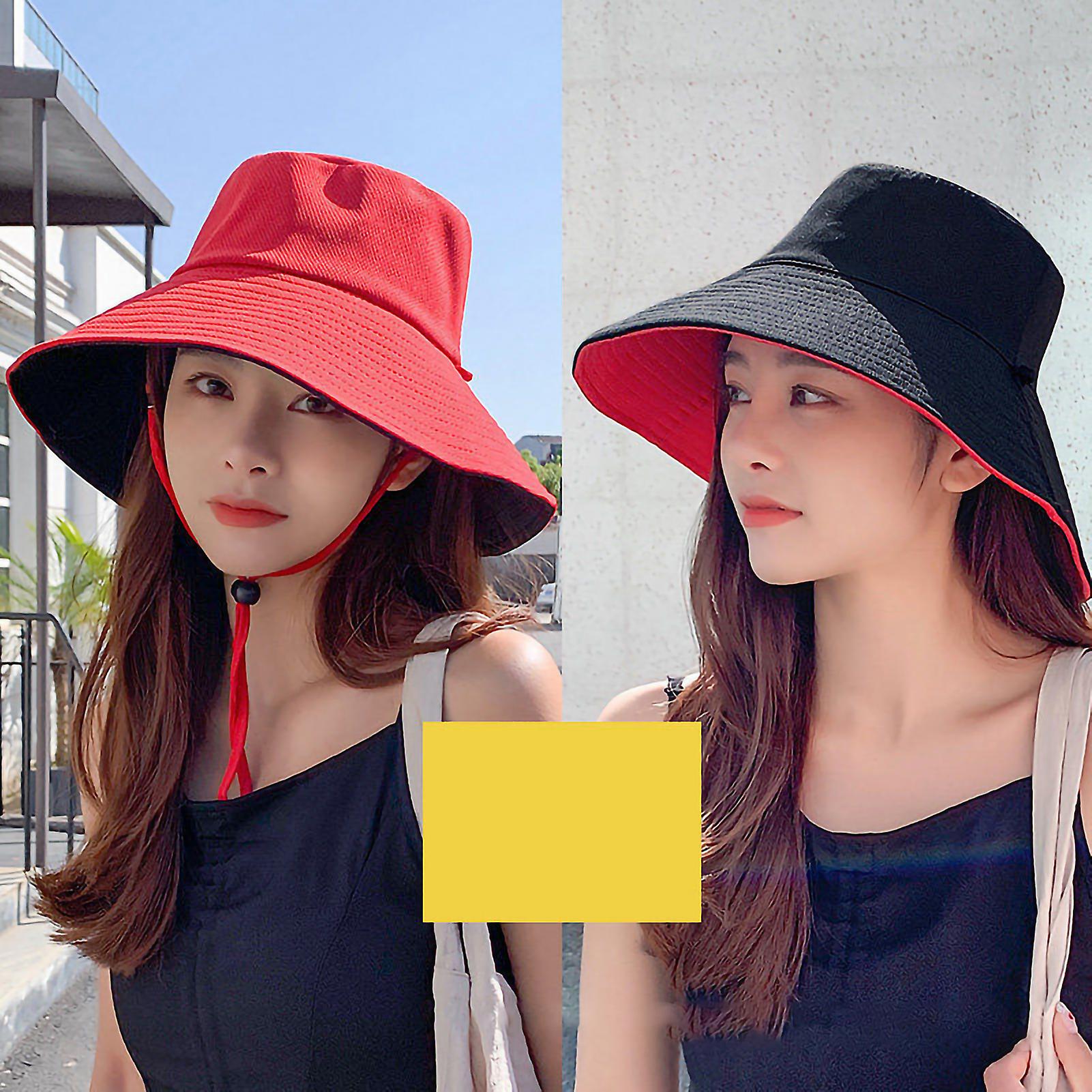 Summer Sun Hat Polyester Fishing Hiking Hat with Wide Brim Windproof Rope for Outdoor Activities(Black Red Free Size)