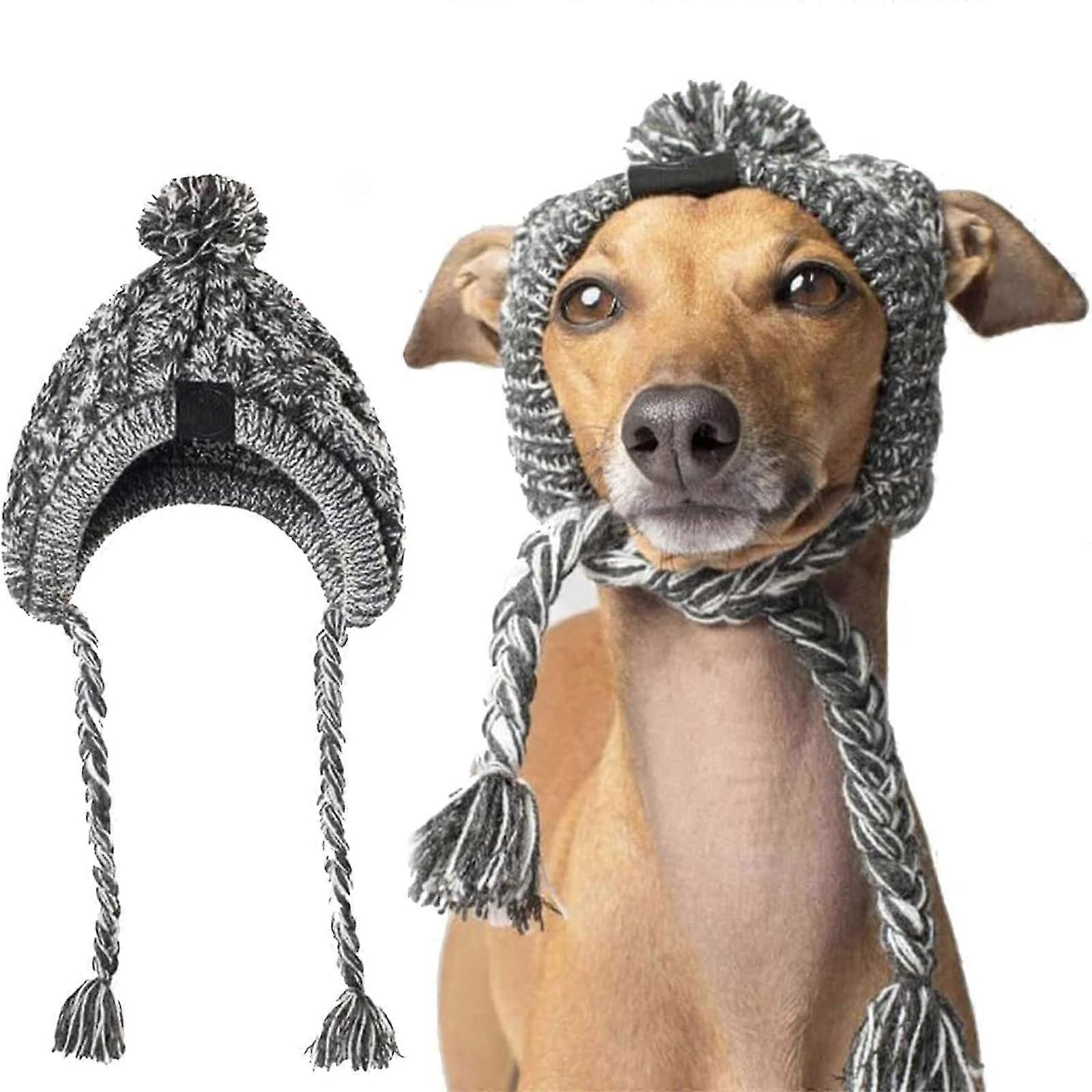 Winter Dog Warm Pom Hat, Knit Dog Beanie Puppy Dog Cap with Ear Holes and Long Tassel Pet Knitted Headwear,grey,S