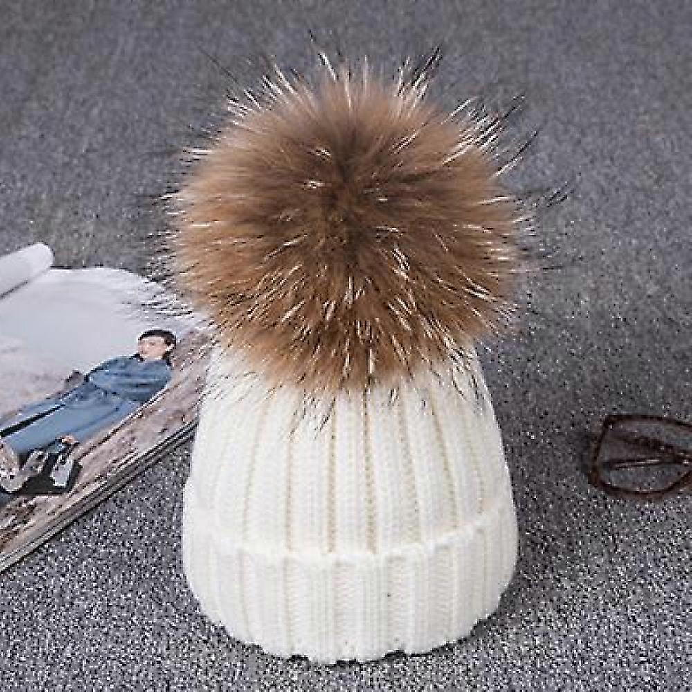 Womens Winter Knitted Beanie Hat With Faux Fur Pom Warm Knit Skull Cap Beanie For Women White EFJ