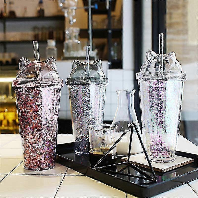 Straw With Glitter Cups Cup Confetti Color -420ml Portable Drinking Water Bottle With Straw Double Layer Straws Water Cups Plastic Drinking Mug