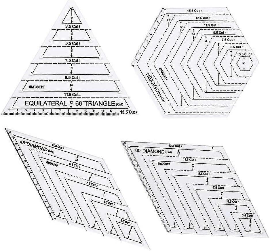 High Quality: The quilted patch ruler is made of high transparent acrylic, which has high strength, high transparency and high durability. The writing is clear, the hand feels smooth, the edges are smudge-free, but it lays well on the fabric. It will not damage the fabric. High Transparency: Our sewing rulers are different from most sewing rulers. Completely transparent structure, you can clearly see the contents to be measured or cut, easy to measure and mark, it is a good helper for making clothes. High Resolution: Our main ruler uses advanced printing technology, the font printing is very clear, and the scale size is accurate. The scale line is fine and clear, and the scale is accurate and easy to read. It's a set of rulers that won't let you down. Standard Size: We offer 4 different sewing rulers to choose from. They can meet your different needs, including triangular sewing ruler, 45 degree ruler, 60 degree ruler and hexagonal sewing ruler. They are ideal tools for hand cutting and panel making. Widely Used: Suitable for all kinds of quilting, sewing, patterns, sewing patterns and crafts. The quilting ruler is a great gift for tailors, students, designers, customers, pattern makers, sewing enthusiasts, etc. Product Description Specifications: Material: Highly Transparent Acrylic Shape: 4 Shapes Quantity: 4 Pieces Color: Transparent Size: Triangular Ruler: 16.2 * 13.5cm / 6.4 * 5.3 Inch 45 Degree Ruler: 30 * 12cm / 11.8 * 4.7 Inch 60 Degree Ruler: 27 * 15.5cm / 10.6 * 6.1 Inch Hexagonal Ruler: 18 * 15.5cm / 7 * 6.1 Inches Weight: Triangular Ruler: 36.2g 45 Degree Ruler: 63.6g 60 Degree Ruler: 70.6g Hexagonal Ruler: 68g Other Selling Arguments: 1. Transparent acrylic material is very durable and lightweight, not easy to fade. Completely transparent structure, easy to measure and mark. 2. Both rulers have a convenient one-sided metric design with accurate scales, clean lines and good readability. 3.It is suitable for cutting clothes, painting, etc. It is an ideal tool for hand cutting and panel making. 4.It is the perfect tool for tailors, fashion designers or craft enthusiasts. It is an ideal choice for various crafts such as sewing, tailoring, quilting, quilting, hemming, binding, wrapping, scrapbooking, knitting, etc. Packaging : 1 * Triangular Ruler 1 * 45 Degree Ruler 1 * 60 Degree Ruler 1 * Hexagonal Ruler Tips: 1. Due to manual measurement, please allow 1-2cm error. Thank you for your understanding. 2. Monitor is not calibrated same, item color displayed in photo may be showing slightly different from the actual product. Please refer to the actual product.