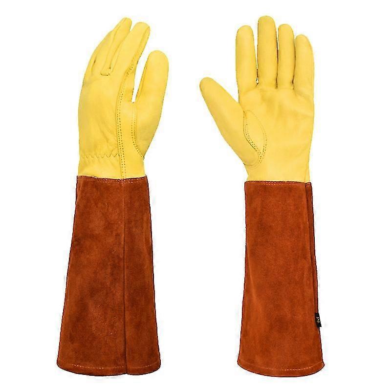 100% Natural Goatskin Hands and Cowhide Sleeves Gardening Gloves (sweet design)Super Long-Sleeved Gardening Gloves: gardening gloves have a long-sleeved design almost to the elbow, The long sleeves are made of thick cowhide material, which doubles the overall protection of the arm, The cowhide is very strong and wear-resistant, allowing you to deal with tall thorn plants and Poison vines ,can reduce exposure to hand skin, avoid letting your forearms hurt.Heavy-Duty Thornproof Gloves: Thornproof gloves are made of genuine leather, The genuine leather has puncture resistance, It is used to handing cactus, Christmas trees, blackberries, briars, rose bushes, spiny shrubs, pine trees, poison ivy, thistles and other thorny plants, to protect Your hands are protected from these plants.Adjustable Cuffs: You will no longer worry about the tightness of your arms, The designer of Supersfel specially added an adjustable rope for this glove, After wearing it you only need to tighten the adjustment rope according to your own comfort, At the same time, it can prevent fallen leaves, dirt from entering your gloves.Soft & Comfortable: The palm of the glove is made of natural sheepskin, which is soft to the touch, breathable and comfortable, It can be used with confidence whether it is summer or winter, The elastic stretch design on the wrist helps the glove Close to the palm of the hand, Even delicate planting and picking tasks can be easily completed.Well-Made: The ergonomically designed gardening gloves can increase the flexibility and sensitivity of the thumb, make it easier to hold gardening tools, the clever seam structure is sturdy, the details are so outstanding, the best gardening gift for men and women, thanksgiving gift, Christmas gift, gardener's gift. Material: LeatherFeatures: Soft, Good Abrasion Resistance and Puncture Resistanc.Available In Four Sizes : Small, Medium, Large And XLarge To Fit Hands.Protect your hands when gardening, planting trees, pulling weeds ,Andscaping, cactus pruning, rose planting with premium leather gardening gloves, A must have for cactus/rose, these rose pruning gloves provide whole hand and arm protection, theyre made with an adjustable cuff that provides precision-fit comfort, a thicker, more durable cowhide leather cuffs and Goatskin leather palm that provides superior hand protection, and an elastic wrist band that flexes and stretches with your natural movement.