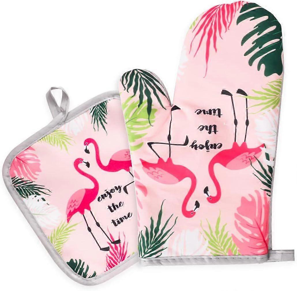 Flamingo Pattern Oven Mitts - Kitchen Potholders BBQ Kitchen (Pink)