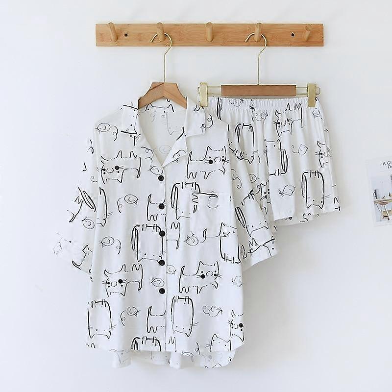 Pencil Cat! Summer New Ladies Pajamas Two-piece Large Size Short-sleeved Shorts Thin 100%cotton Comic Cartoon Loose Home Service