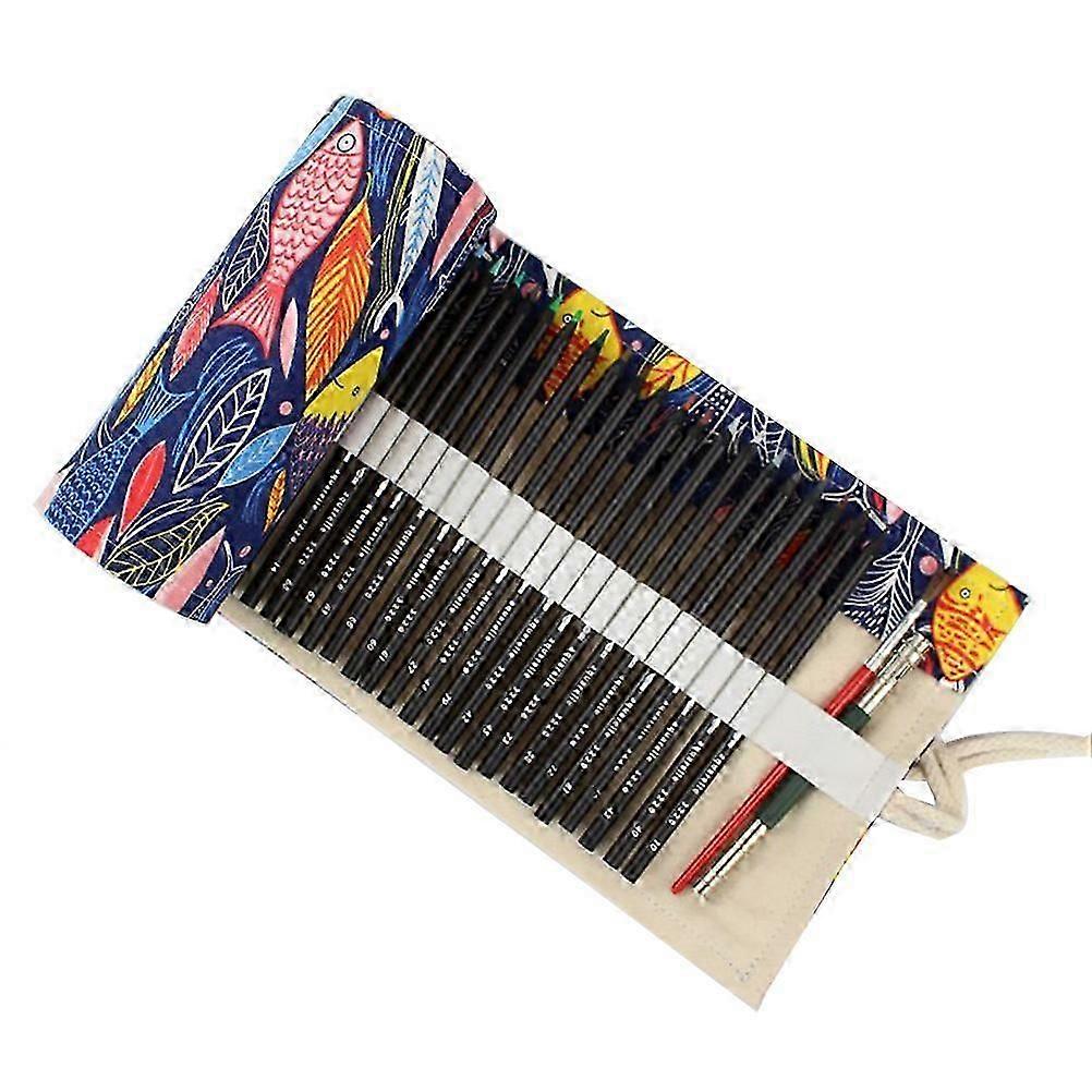 Colorful Fish Pattern Canvas Portable Handmade Knitting Rolling Pencil Roll Wrap Holder Pouch Case Storage Organizer With 48 Slots