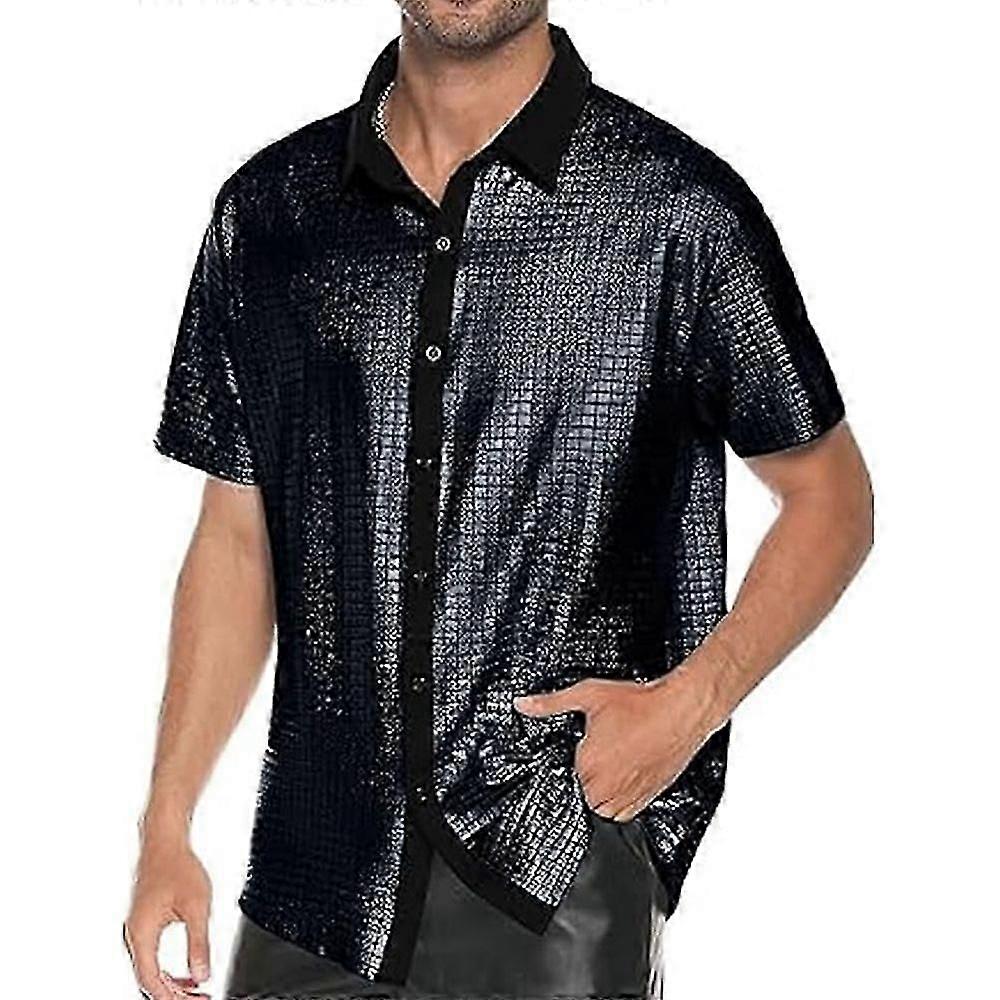 "Men's 70s Disco Shirts Metallic Sequins Shiny Short Sleeve Party Tops Nightclub Prom Shirts"