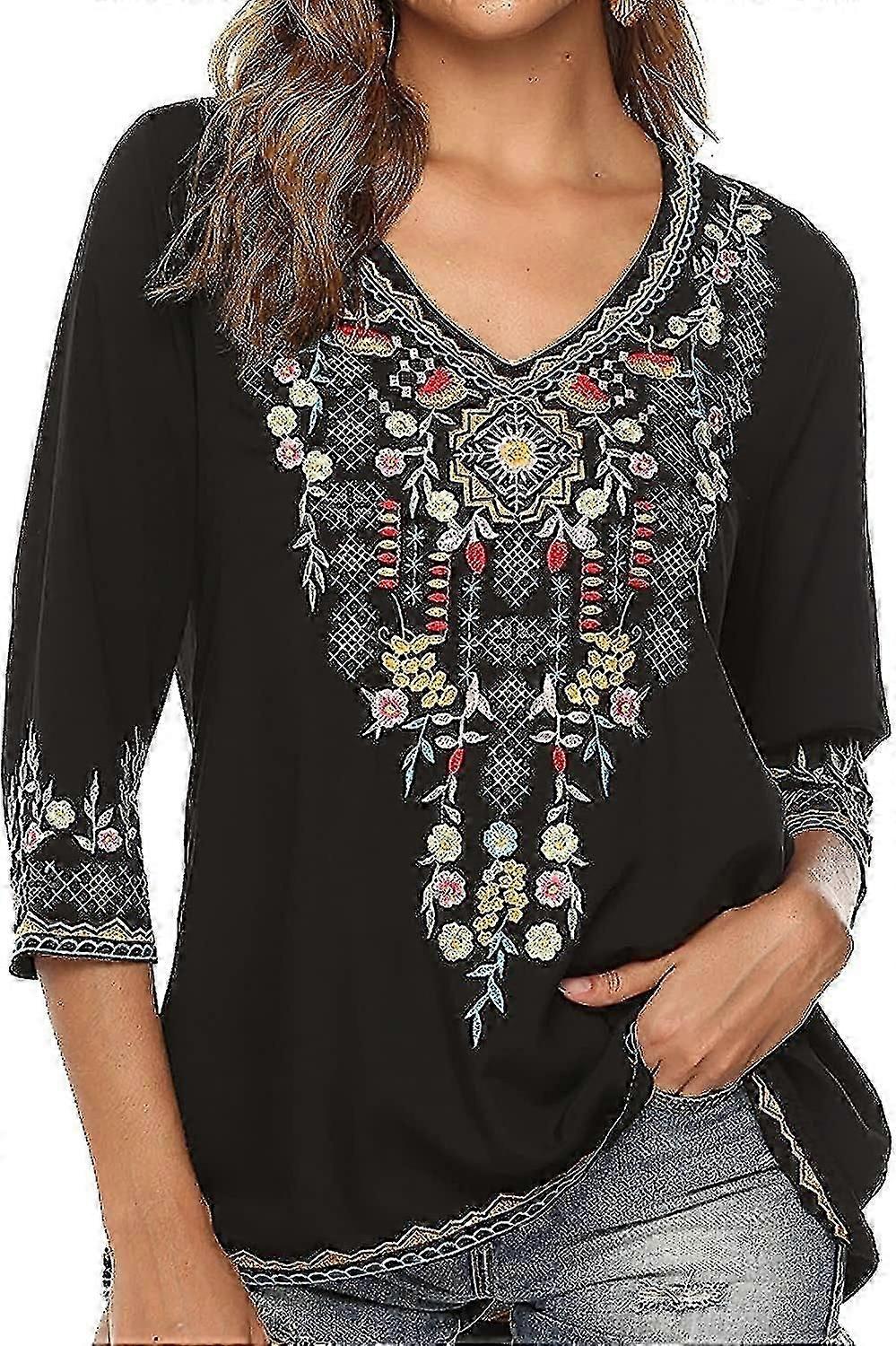 Mexican Embroidered Shirts For Women Boho Tops And Blouses 3/4 Sleeve Bohemian Peasant Summer Fall Tunic Top